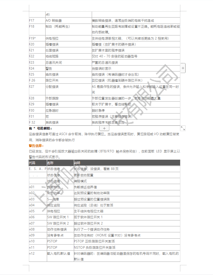 任何出現(xiàn)的錯誤都以一個錯誤代碼的形式在前面板上的LED顯示屏上顯示。所有錯誤消息都會導(dǎo)致BTB/RTO觸點打開,放大器的輸出級關(guān)閉(電機(jī)失去全部轉(zhuǎn)矩)。電機(jī)抱閘被激活。