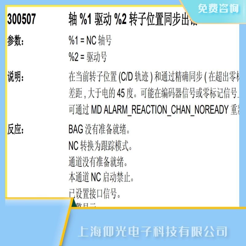 上海仰光工程部溫馨提示:如果設備出現報警或者損壞,不是專業技術人員請勿私自拆卸,以防帶來安全隱患以及給設備造成二次傷害.上海仰光電子-您身邊的設備維修維護專員.關于SIEMENS西門子數控系統840c報警300507維修,面向全國免檢測費的技術問題上海仰光電子提供24小時免費咨詢服務.